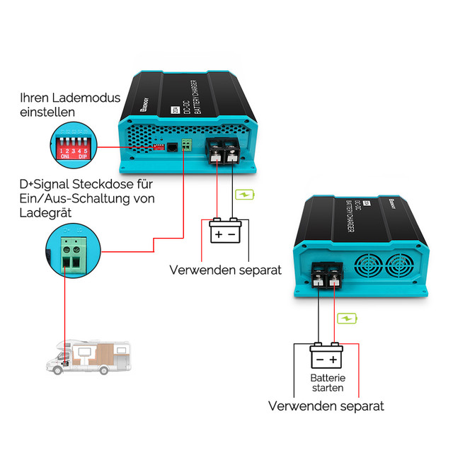 - 【Intelligentes 3 Stufen Laden】Das DC-DC-Batterieladegerät lädt Ihre Servicebatterien aus der Starterbatterie in drei Stufen (Bulk, Boost und Float) auf, um eine optimale und automatische Ladung auf 100 % sicherzustellen.