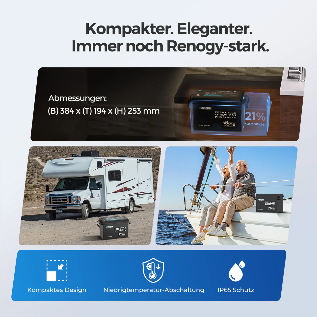 - · Kleiner als je zuvor! 1/3 kleiner als eine 12V 200Ah Blei-Säure-Batterie.